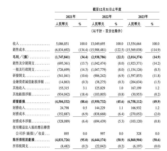 同时,我们在招股书上看到,哪吒汽车2021年至2023年,其净亏损分别为48.40亿、66.66亿、68.67亿元,三年累计亏损183.73亿。