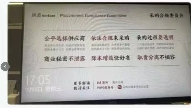 值得注意的是有网易员工表示,当天,公司电脑的屏保被统一更换为合规宣传“公平选择供应商、依法合规来采购、采购过程要透明、商业秘密不泄露、降本增效快好省、职责分离不相容”。对此有网易相关人士告诉“银柿财经”,这份反腐廉政合规通知早已存在,公司电脑屏保会不定期更换。