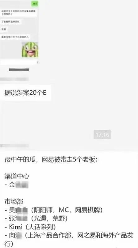 昨日,一份关于网易游戏内部严查贪腐,涉及营销线多名高管的聊天记录在网上流传。该图片显示,网易游戏市场部总经理向某等人已被带走调查,涉案合同金额大概在20亿元的规模。