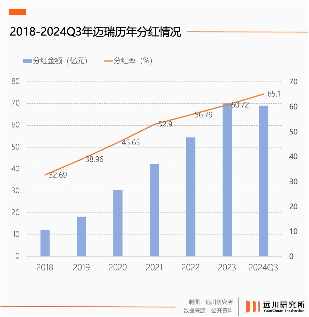 继中报大手笔分红后,迈瑞医疗在三季报继续宣布了面向全体股东的大额分红——共计20亿元,合每10股派息16.5元,2024年两次中期分红比例达到了65.1%。