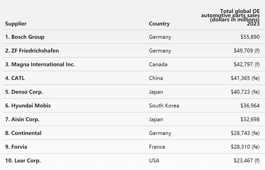 《美国汽车新闻》发布的2024年度全球汽车零部件配套供应商百强榜显示,包括名列第四位的宁德时代,中国(含香港地区)共有15家企业入围百强。