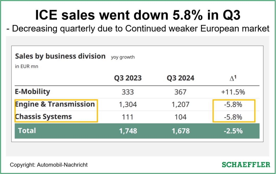 舍弗勒集团此次在欧洲区裁员的4700人中,有1700人来自动力总成、底盘和电驱动领域。这与欧洲地区整体销量大幅下跌、中国加速向电驱动转型导致合资油车销量加速下滑因素密切相关。再次背景下,舍弗勒集团发动机、变速器及底盘系统业务Q3销售额同比减少5.8%。