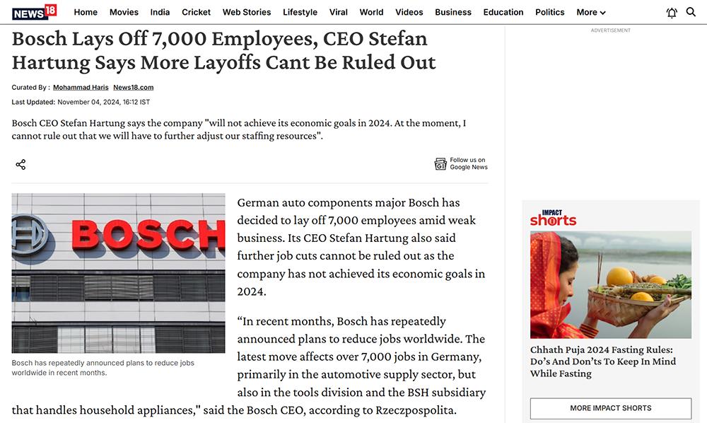 据环球网援引波兰媒体Rzeczpospolita的报道,11月4日,全球第一大汽车零部件供应商博世表示,由于无法实现其财务目标,公司可能会进一步调整人员配置。