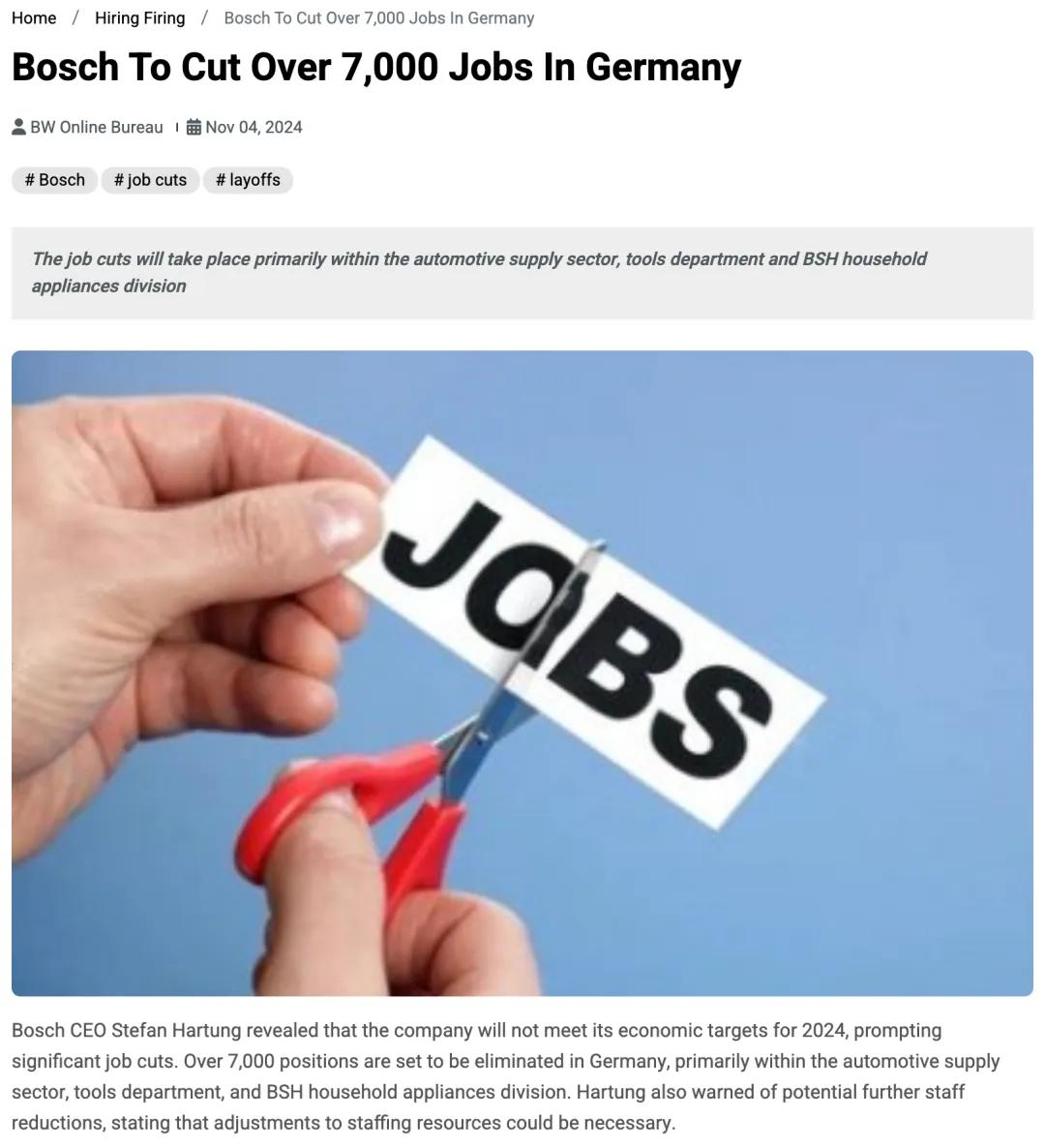 据了解,最新的裁员行动影响了德国7000多个工作岗位,主要涉及汽车供应部门,同时也波及到工具部门和负责家用电器的BSH子公司。在不到一年的时间内,这已经是博世的第四波裁员行动。