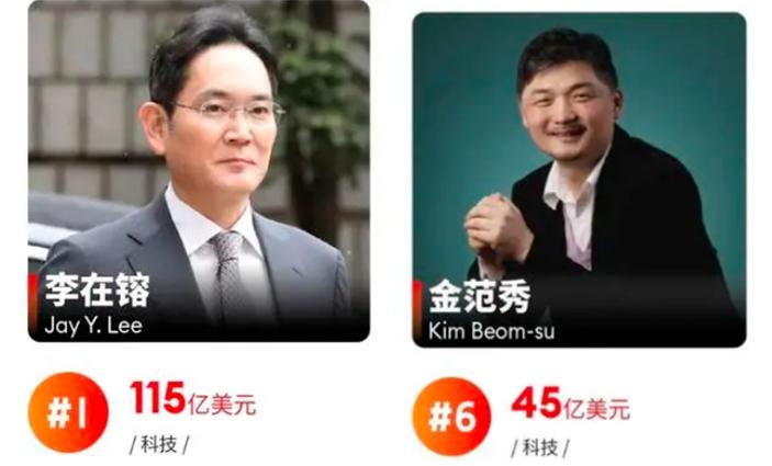 《2024福布斯韩国富豪榜》上,李在镕凭借115亿美元身价,第一次成为韩国首富。金范洙则以45美元身家位列第6位。