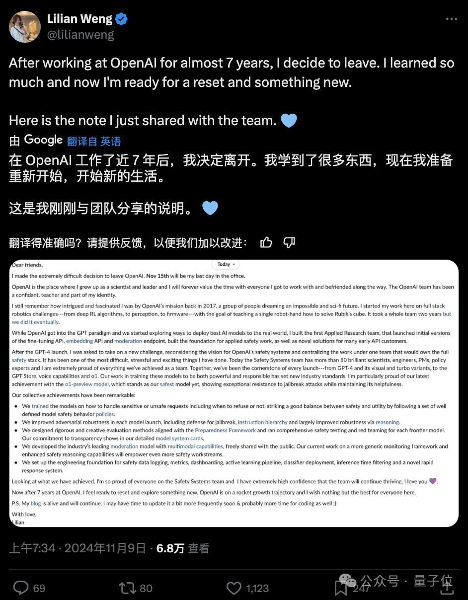 那个掌管OpenAI安全的北大校友,OpenAI研究副总裁(安全)翁荔,离职了。