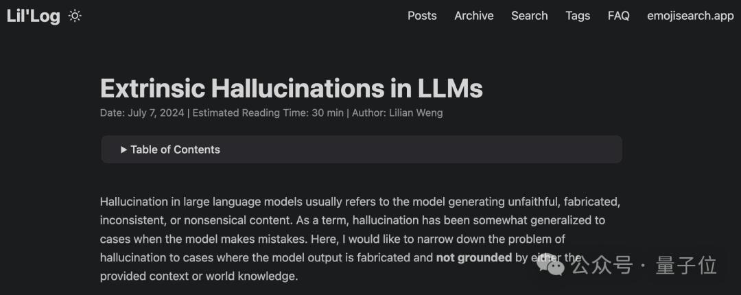 此前她提出的提出LLM外在幻觉(extrinsic hallucination)的博文也是非常火爆。