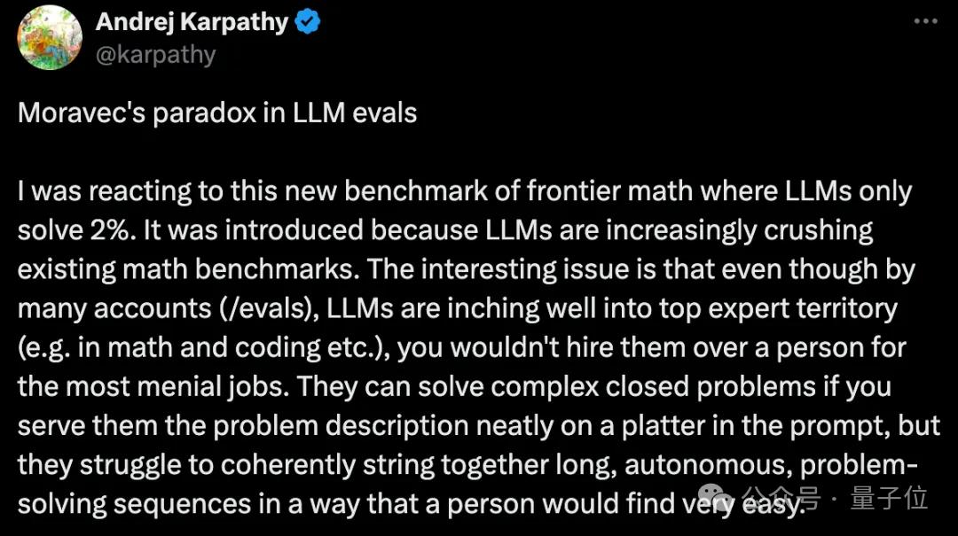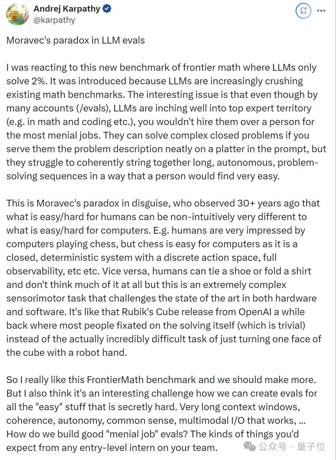 这也合了卡帕西的心意,他认为这样的新基准应该更多,尤其是为那些看似“容易”的事情创建评估。