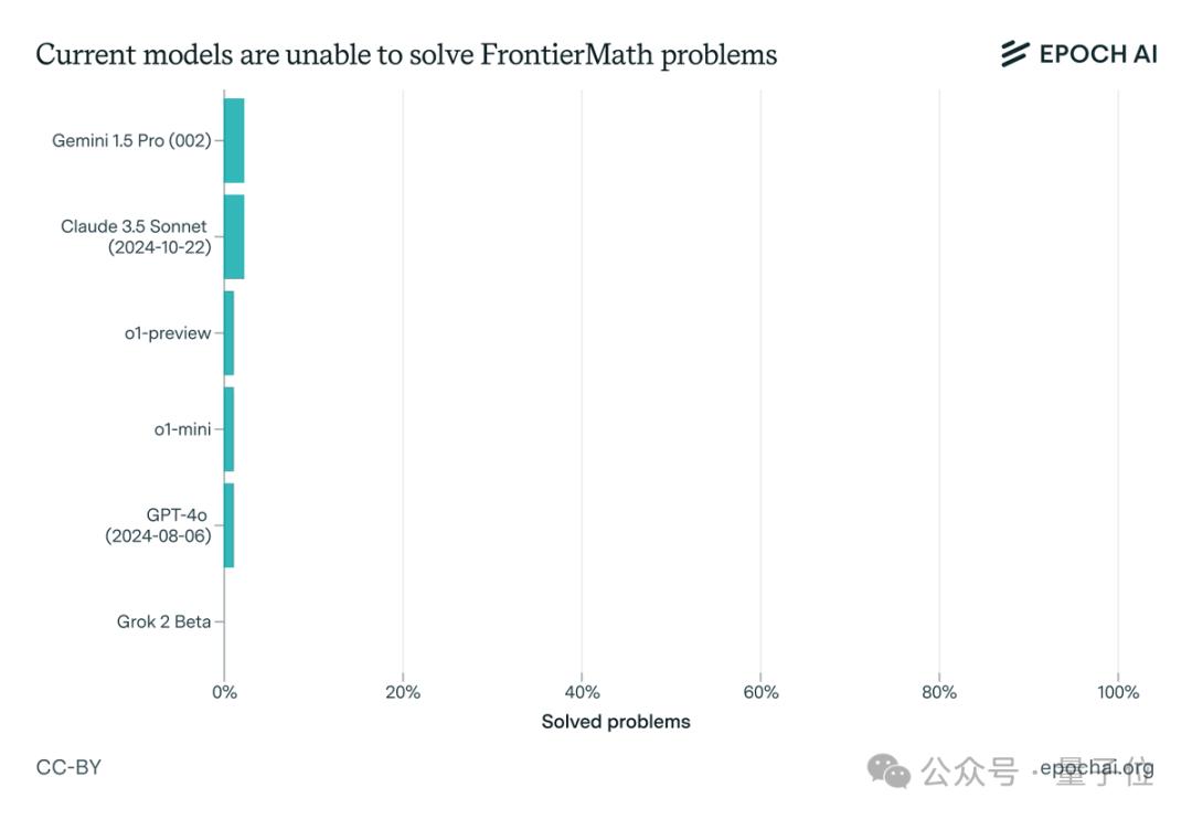 一出手,曾在国际数学奥赛中拿下83%解题率的o1模型就败下阵来,并且Claude 3.5 Sonnet、GPT-4o、Gemini 1.5 Pro等全都未攻破2%这一防线。