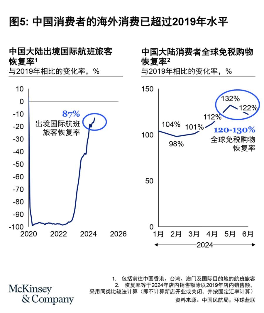 而与国内旅游消费形成反差的是,在出境游尚未完全恢复到疫情前水平的情况下,中国消费者的海外消费已经超过了2019年的水平,麦肯锡《中国市场简报:中国消费市场的真相》资料显示: