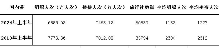 2024年第二季度全国旅行社国内旅游组织4810.72 万人次,2019年同期为4645.72万人次。相比之下,旅行社的组织人次还略有增长。