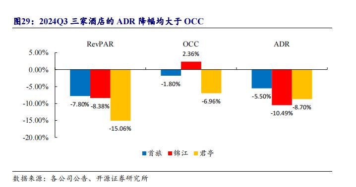 酒店:从国内已公布三季度财报的酒店数据来看,首旅、锦江、君亭三家公司 2024Q3 的 RevPAR 分别下滑了7.8%、8.38%和15.06%,平均房价(ADR)分别下滑了5.5%、10.49%、8.7%。