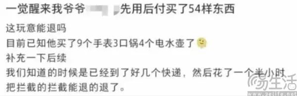 就在今年这个双11,有部分消费者在社交平台吐槽称,不知何时买了一堆不在购物清单上的东西。此外更是有网友发文称,“一觉醒来爷爷先用后付买了54样东西。”
