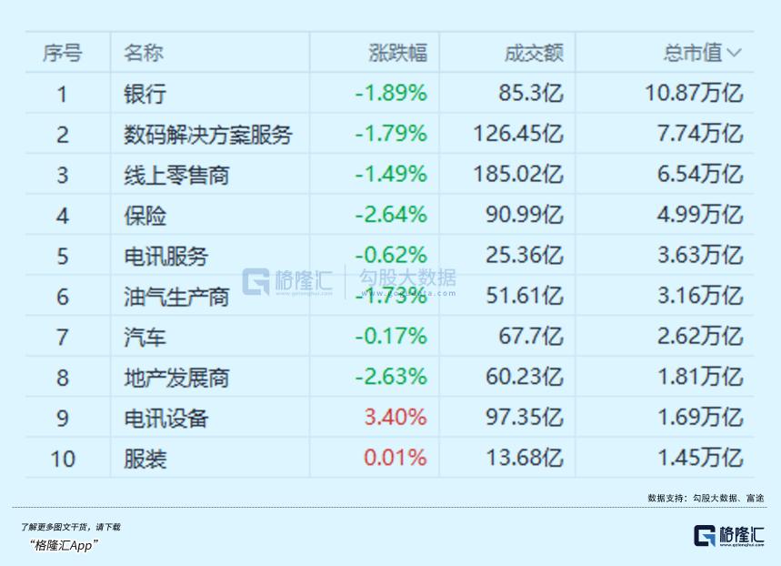 银行保险、零售消费、地产等几大主板块清一色明显下跌,其中不乏各自领域下的核心龙头,显著拖累的港股大市的走势。