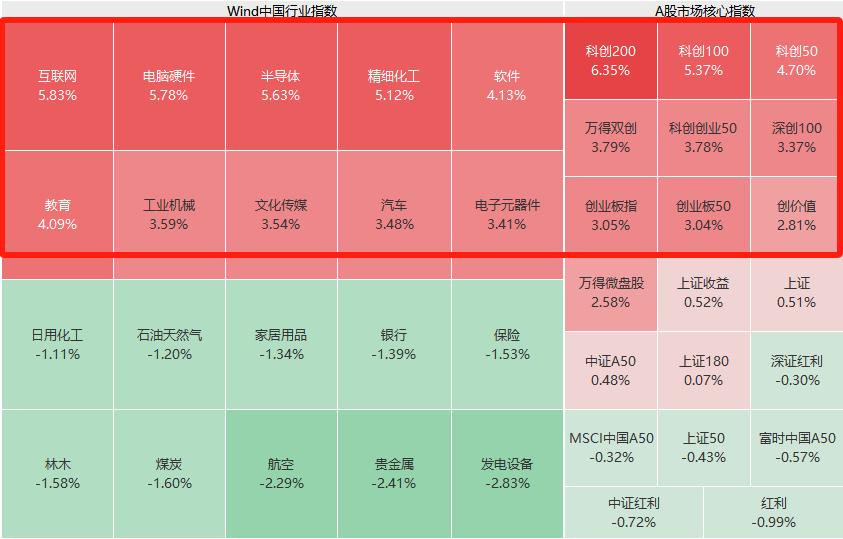 截至收盘,A股从低开低走到强势被拉升上涨,创业板都大涨超3%,涨幅榜前列基本也都是芯片、科创类概念领先,涨幅超过3%的比比皆是。