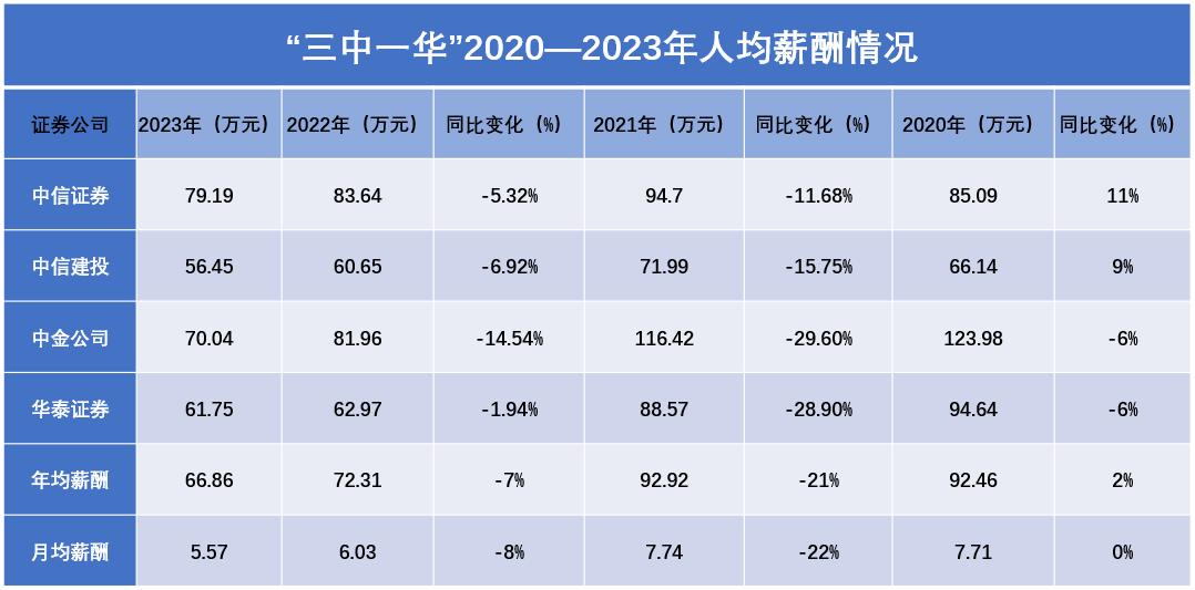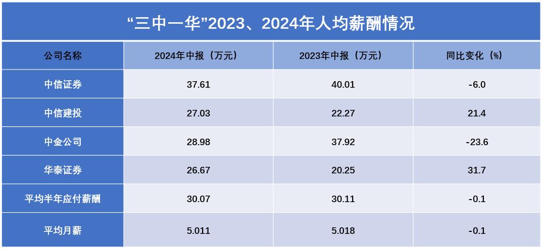 从手中流动的数额没变,进入口袋的工资却开始缩水。以因高薪闻名的头部券商为例,Wind数据显示,截至2024年6月30日,4家国内头部证券公司“三中一华”(中信证券、中信建投、中金公司、华泰证券)的员工共71017人,人均半年应付薪酬预估30.07万元。也就是说,在包含了去年年终奖金的情况下,“三中一华”今年上半年每月人均薪酬约5万元。