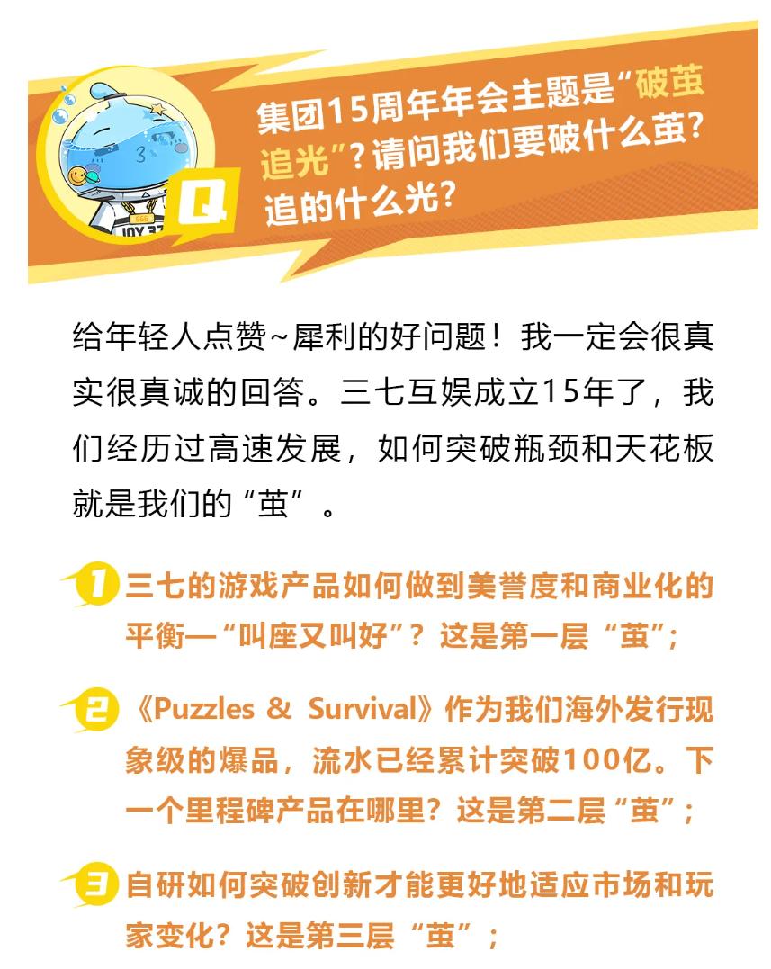 在今年三七互娱开展的秋招特殊QA环节上,李逸飞就三七目前需要破除的“三层茧”进行解释:第一层茧是如何做好产品美誉度和商业化的平衡;第二层茧是三七游戏出海的下一款里程碑产品在哪;第三层茧是如何才能更好的适应市场和玩家变化?