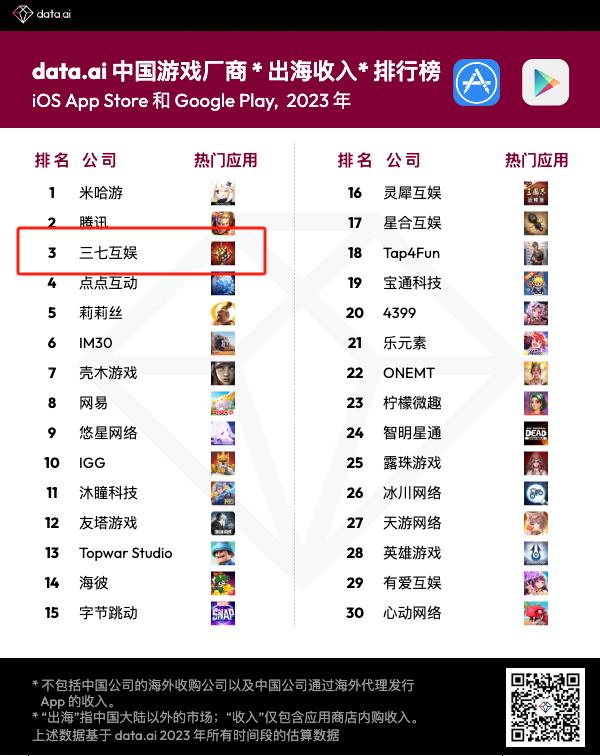 (data.ai 2023年中国游戏出海收入榜单,三七位列第三)