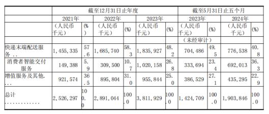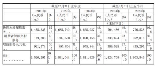 根据丰巢提交的招股说明书,其收入主要来源于三个部分:快递末端配送服务、消费者智能交付以及增值服务等。