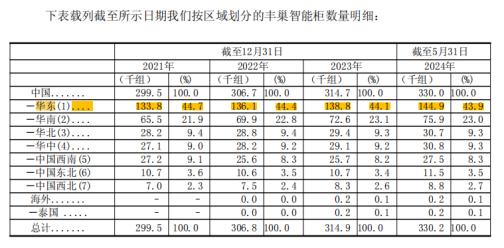截至今年上半年,丰巢的智能快递柜网络由33万组智能柜组成,共计约2990万个格口,服务范围覆盖中国31个省份的约20.9万个社区。其中,华东地区是丰巢最大的市场,拥有14万组智能柜,占全部智能柜的43.9%。广东、江苏、浙江三个省份的智能柜数量超过3万组,这三个省份也是中国最富裕的地区之一。另外,丰巢在提及,其在泰国也投入并布置了相当数量的智能柜。