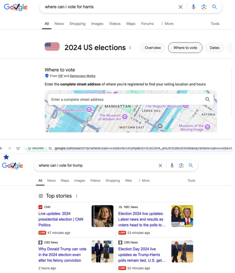 最“鸡贼”的当属Google。美国网民发现,如果在Google搜索栏输入“我可以去哪里投票给哈里斯?”,页面会显示投票站的地图,并引导用户去最近的投票点;但如果输入“我可以去哪里投票给特朗普?”,页面只会显示有关特朗普的媒体报道,而不会出现地图。