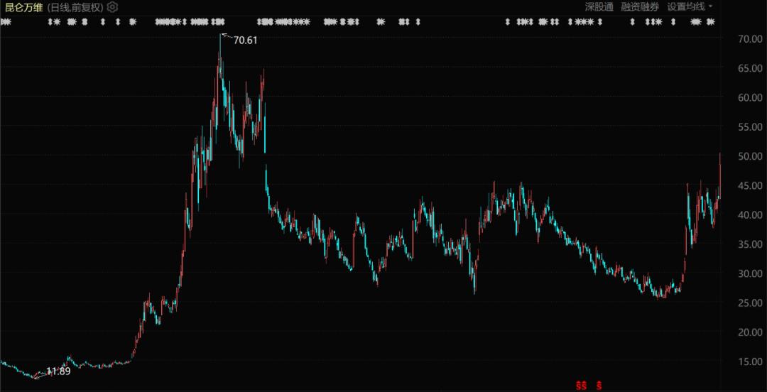 同样在2023年大幅受益于AI概念的昆仑万维,尽管当时并无特别亮眼的AI应用落地,股价却也在5月5日上涨到了历史性高位70.61元/股。
