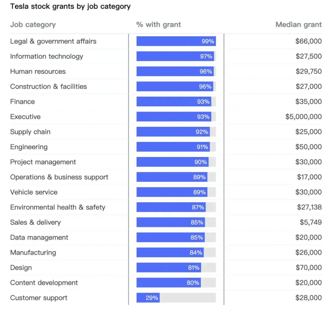 图|特斯拉各岗位的股票奖励中位数