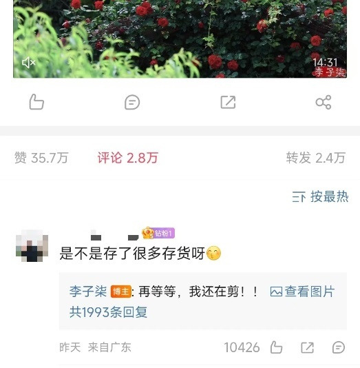 而在粉丝问及“是不是存了很多存货”,李子柒也回复道:“再等等,我还在剪!!”这也算是侧面回应了,在停更的这段时间,李子柒确实还有多条视频还未发布。