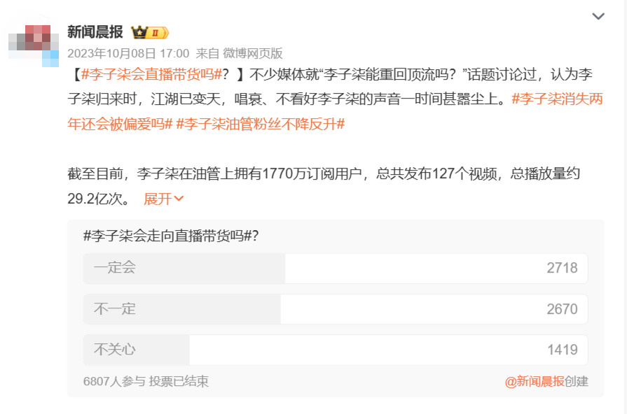 此前,微博就曾就“李子柒会走向直播带货吗”进行话题讨论,其中超半数认为“一定会”。对如今的网友来说,不管是前几天的瑞士卷事件,还是近期的劳斯莱斯女车主事件,公众对带货这个词显然已经开始ptsd,火了就带货或者刻意制造话题带货,让“直播带货”甚至开始趋向贬义词。