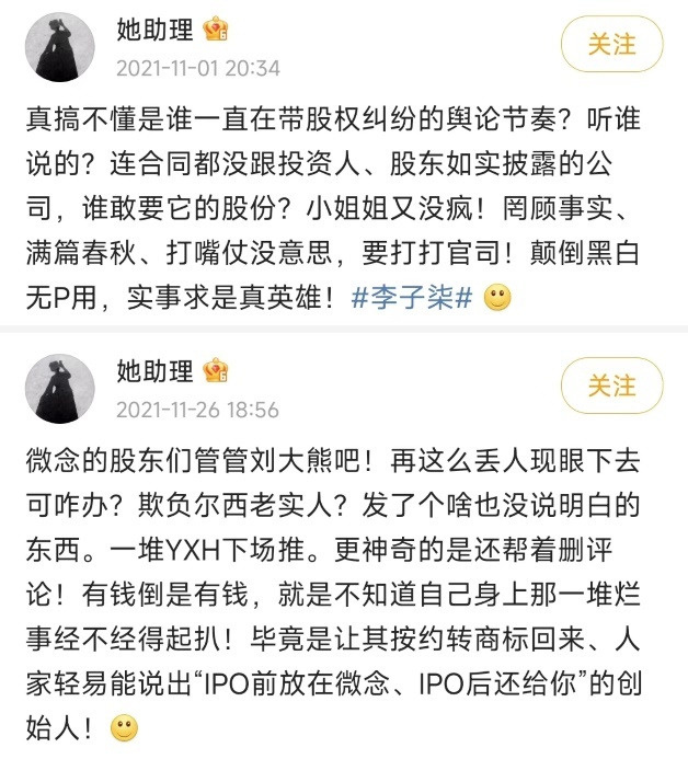 在此期间,李子柒的助理多次发布微博,将矛头直指微念。
