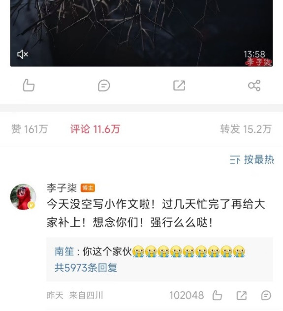 在自己原先的大本营微博中,李子柒还说道:“今天没空写小作文啦!过几天忙完了再给大家补上!”