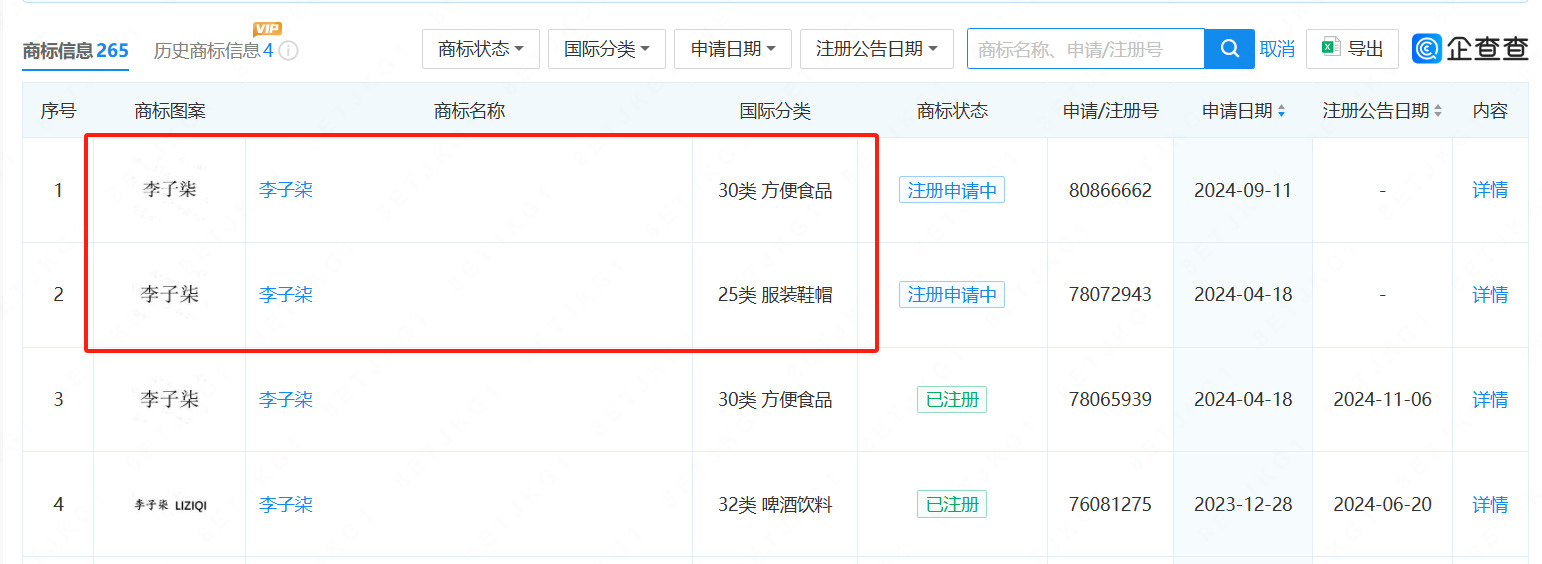 而据企查查信息显示,今年,子柒文化也曾两度申请李子柒商标,分类包括方便食品和服装鞋帽,这是否意味着,李子柒未来会重新拿回“李子柒”商标使用权,自己做品牌,直播带货?