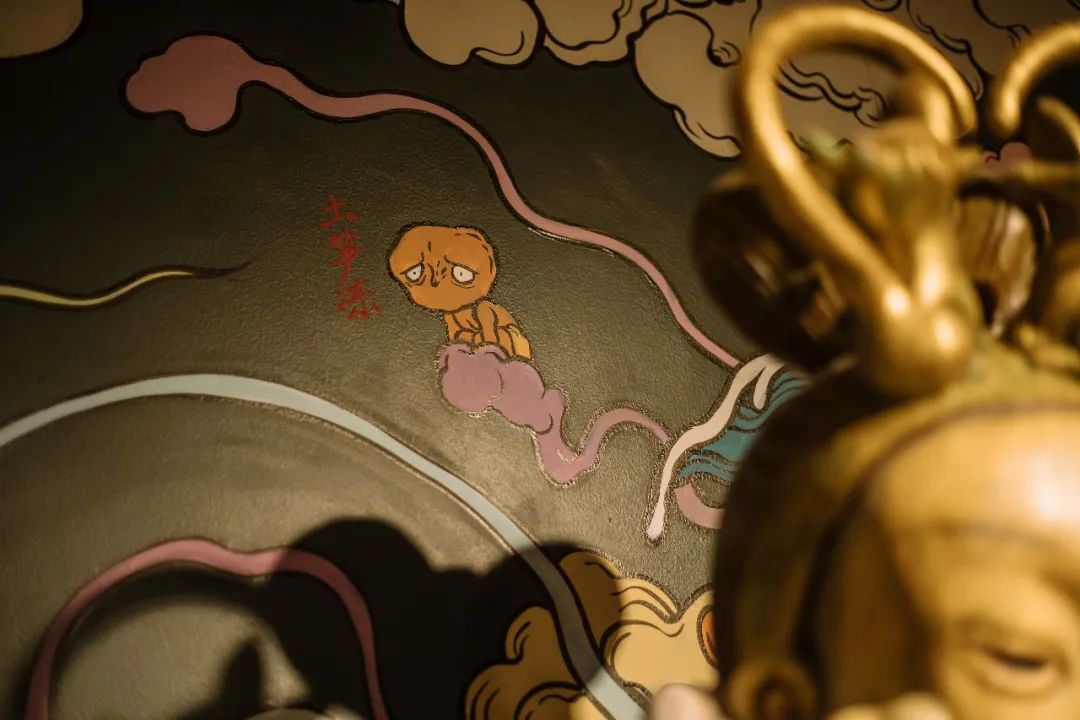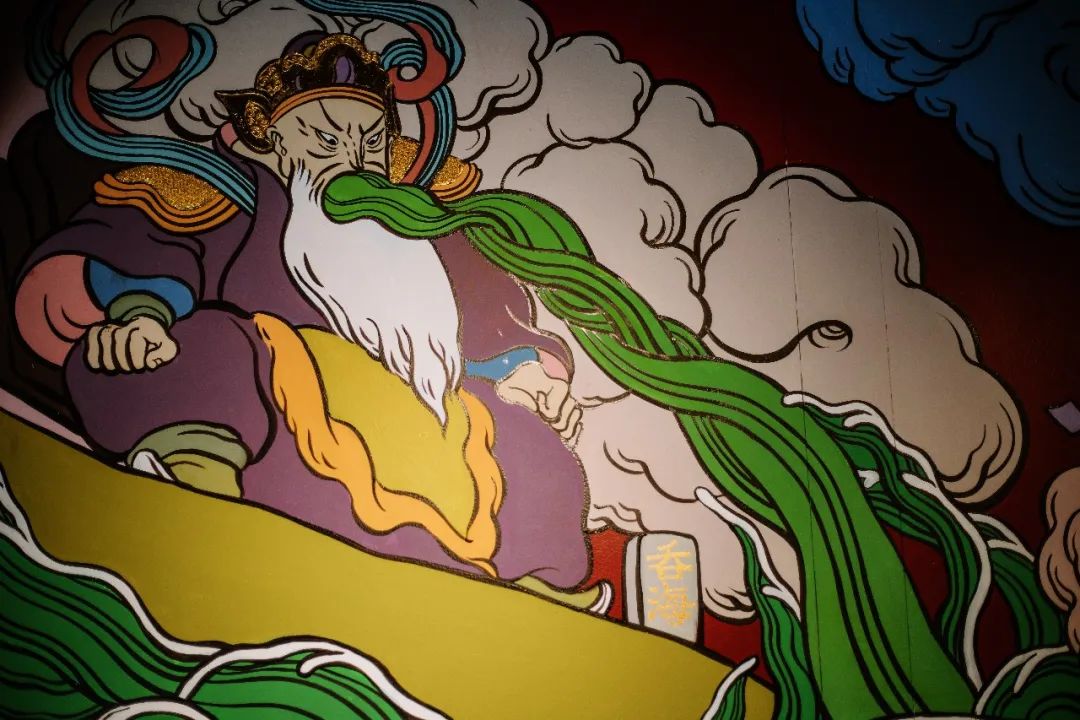 创世神话的结尾是壁画形象“吞海”,壁画上还用到了泉州的漆线雕和宝石金箔