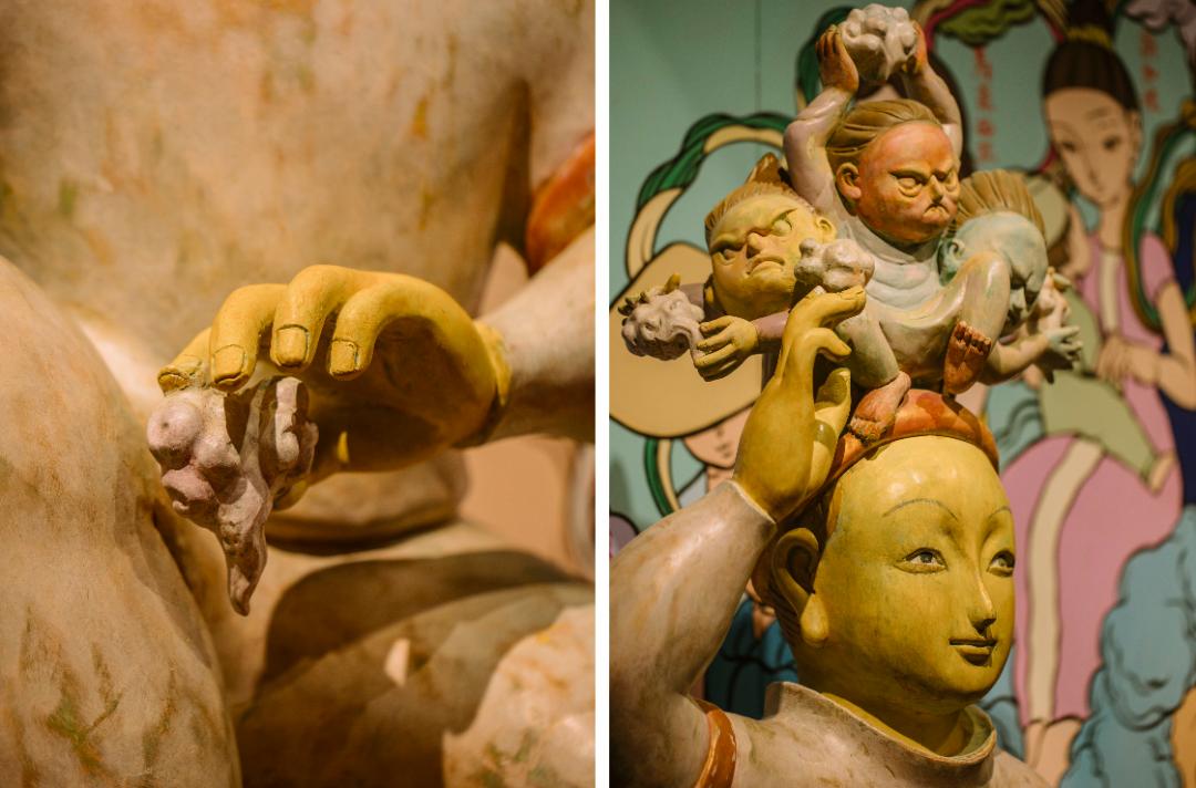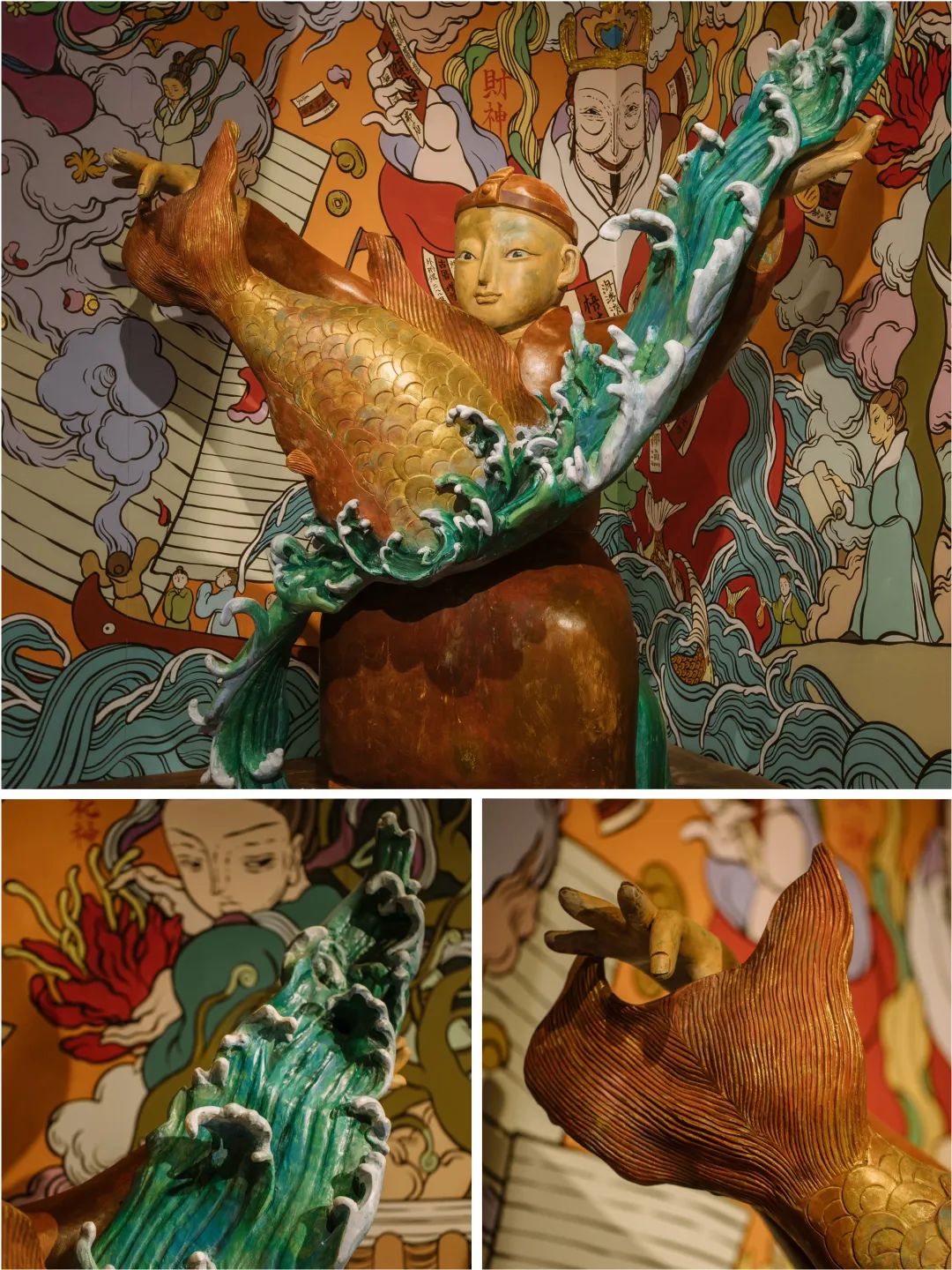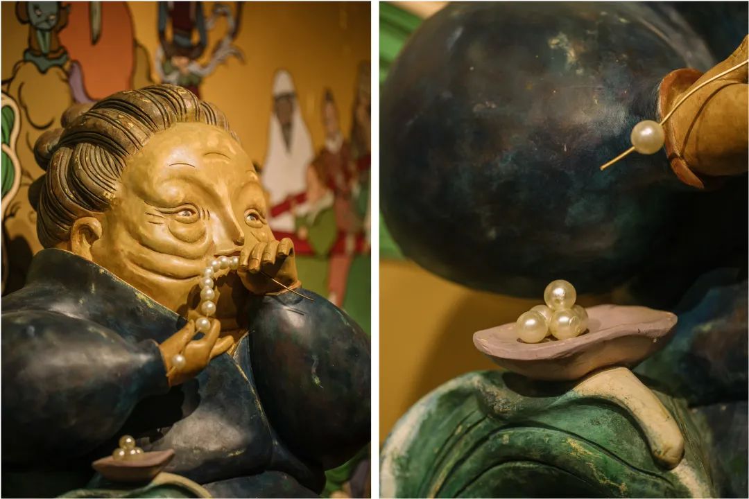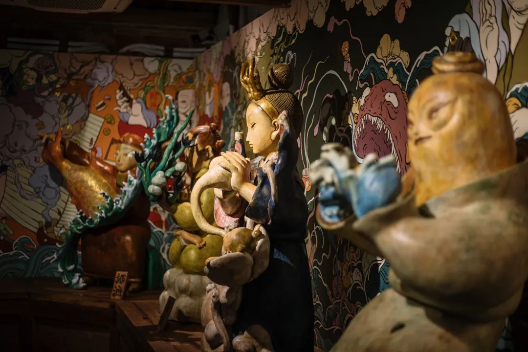 自中原移民到海边的人,从大海中夺取精华与气息,滋养自己的子孙后代。在雕塑后面的壁画上,我不仅画了小鱼干、小鱿鱼、小螃蟹、小贝壳,还有海中的巨大怪兽,这是一个有烟火气息又奇幻壮丽的生活场景。