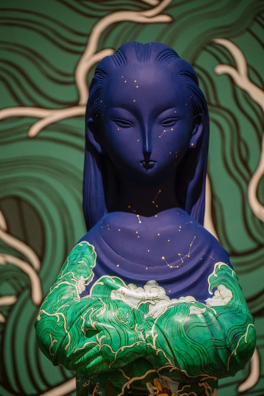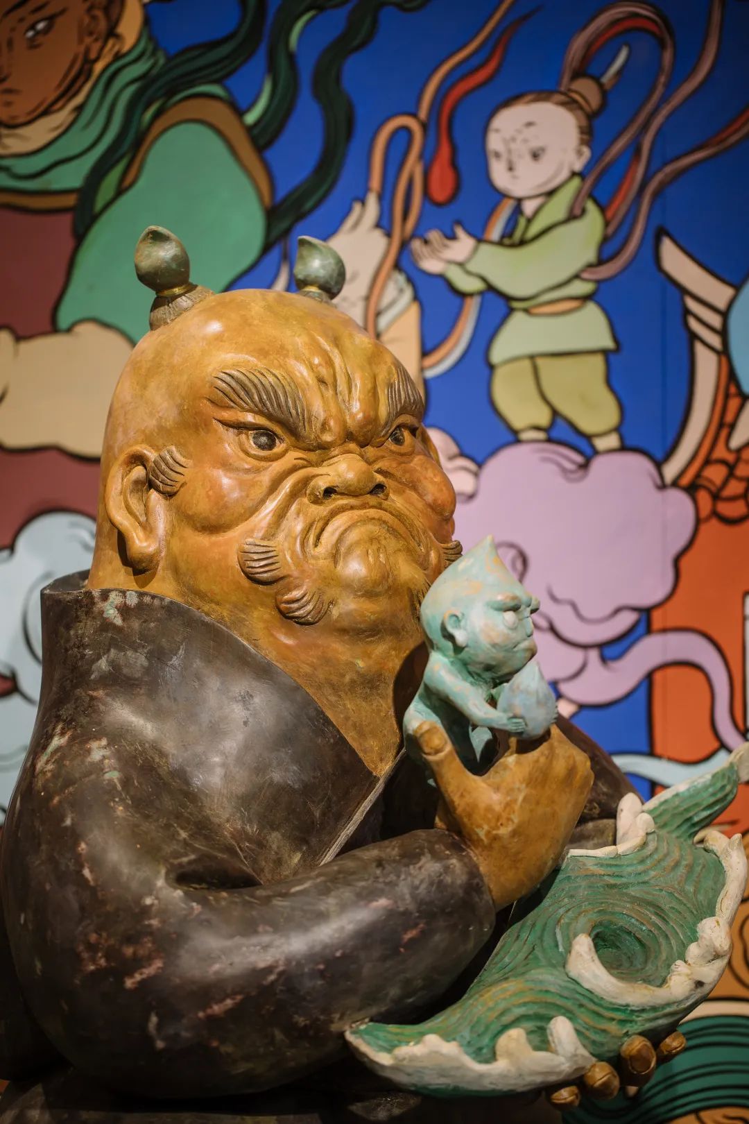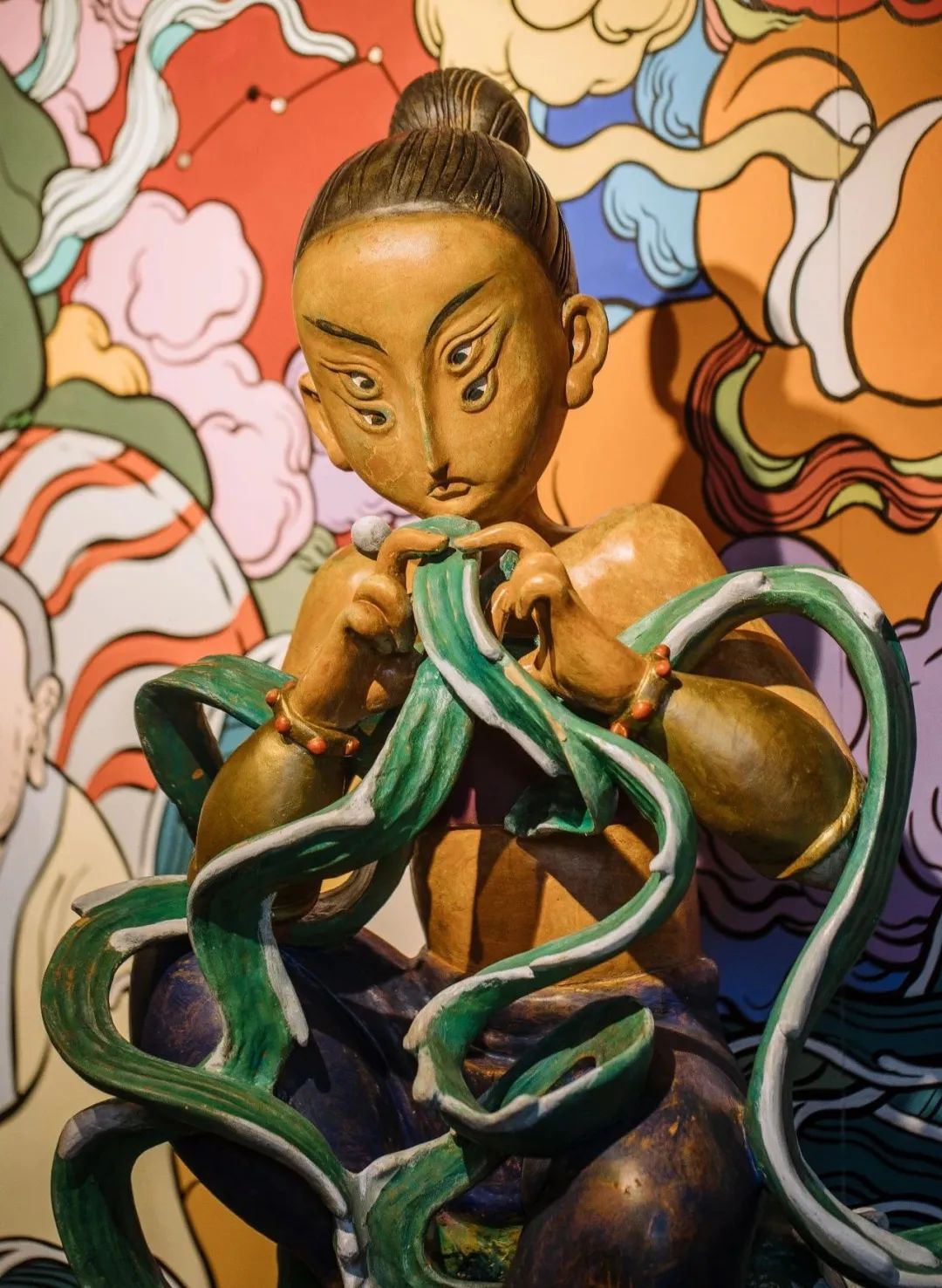 自中原移民到海边的人,从大海中夺取精华与气息,滋养自己的子孙后代。在雕塑后面的壁画上,我不仅画了小鱼干、小鱿鱼、小螃蟹、小贝壳,还有海中的巨大怪兽,这是一个有烟火气息又奇幻壮丽的生活场景。