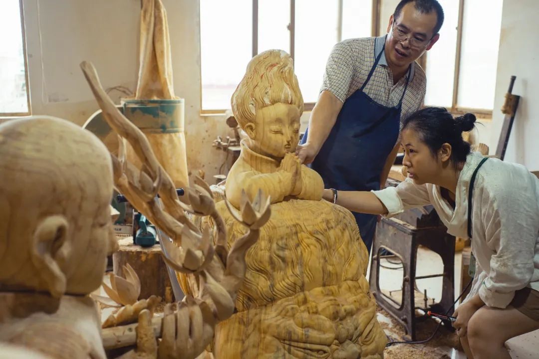 文那和增煌、木雕师傅在一起工作