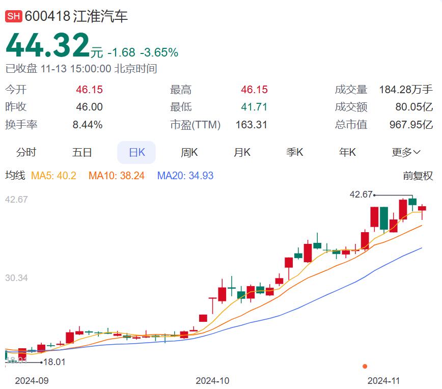11月13日,江淮汽车(600418.SH)盘中跌幅一度超8%,一反近期上涨状态。当日收盘报44.32元,下跌1.68元,跌幅为3.65%,市值定格968亿元。