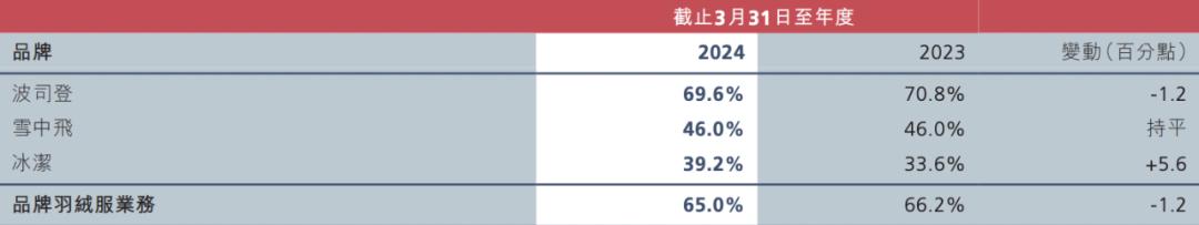 两个品牌增幅的比较,固然有波司登主品牌体量大、增幅变动小的原因,但也从侧面说明了雪中飞更贴合消费者的现实需求。此外,波司登主品牌的毛利率,还从22/23财年的70.8%降低到了23/24财年的69.6%,带动整个品牌羽绒服业务毛利率同比下滑了1.2个百分点。