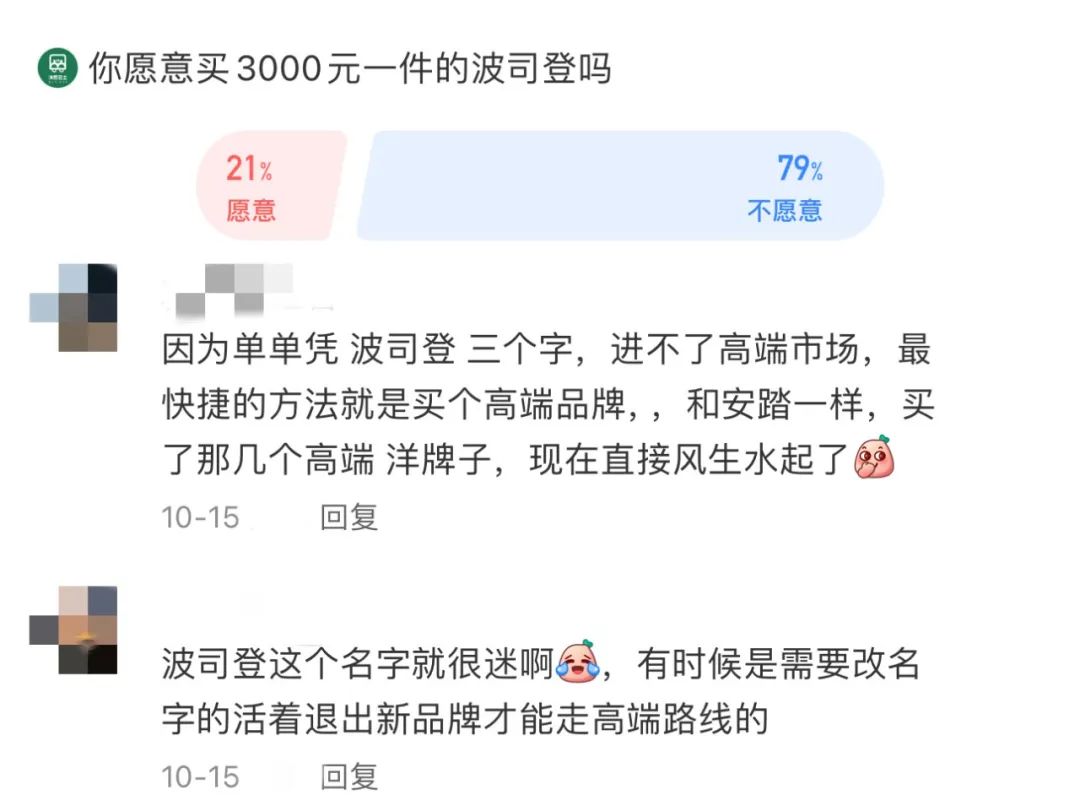 消费巴士曾做过一个消费者小调查,问大家是否愿意买3000元一件的波司登,有79%的人选择了“不愿意”。而一位消费者今年双11在比对了波司登和高梵的同价位产品后,基于可以男女同款穿着的性价比、以及冬季外出的实用性,选择了后者。她说她去波司登的线下店试过衣服,看到店内有不少人在试贵价羽绒服,但“大家买波司登还是会考虑值不值,无论三千还是五千”。