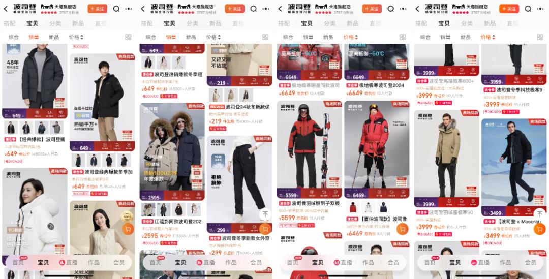 第一组数据关乎波司登到底什么价位的羽绒服卖得好。以天猫官旗店为例,它的“羽绒服热销第一名”是一件原价999元、券后649元的男款羽绒服,页面显示已售4万多件,紧随其后的是同等价位、同等优惠力度的另两款羽绒服,历史销量加起来超3万件。畅销榜唯一一款排名靠前、价格上2000的羽绒服,历史销量是9000+。