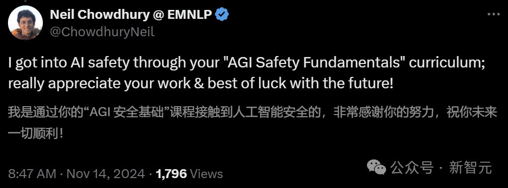 前OpenAI员工(今年8月离职)回忆道,自己是通过Ngo「AGI安全基础」课程才接触到AI安全的,并祝他未来一切顺利。