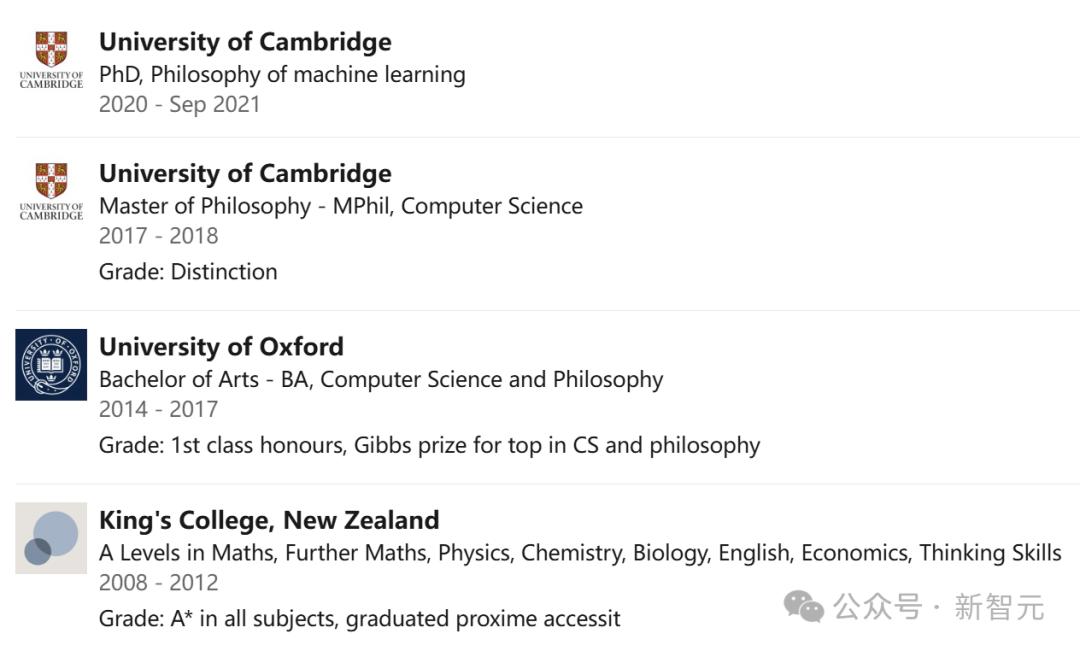 他在剑桥大学获得了机器学习哲学的哲学博士学位(2020–2021),并在同校获得了计算机科学的哲学硕士学位(2017–2018)。此外,他还在牛津大学获得了计算机科学与哲学的文学学士学位(2014–2017)。