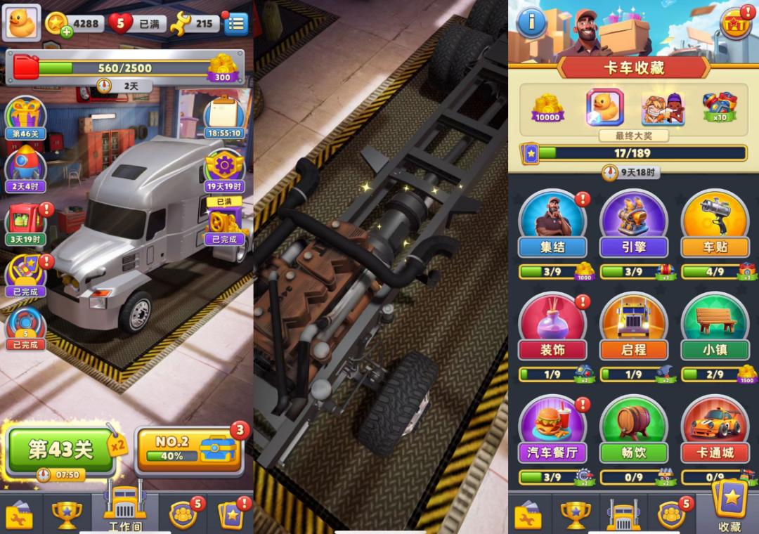 《Truck Star》的玩法类似于《Royal Match》。《Royal Match》在外围系统设计了简单的装修玩法,而《Truck Star》则改成了卡车维修玩法。玩家在《Truck Star》中需要通关三消关卡中赚取「扳手」(相当于《Royal Match》中的星星),并且对来客的卡车进行拆卸和重装。