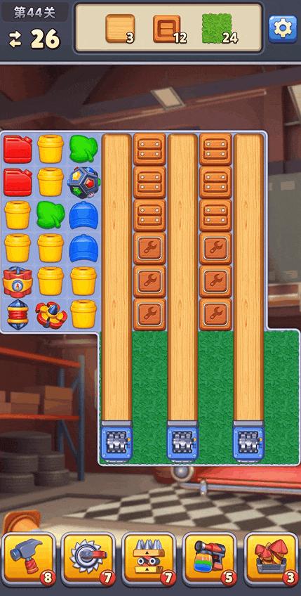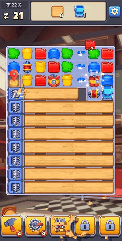 另外《Truck Star》还增加了新的额外道具「烟花」,可以在棋盘上造成随机3次区域消除。相较于「锤子」道具(指定消除1格)更具效率,但是也伴随着随机性,促使玩家需要在效率和风险之中做选择。