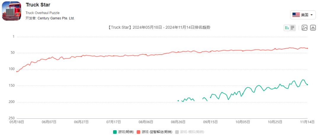 靠着创新题材和优化玩法,《Truck Star》挖掘了休闲品类中的男性向市场,并取得了还不错的成绩。