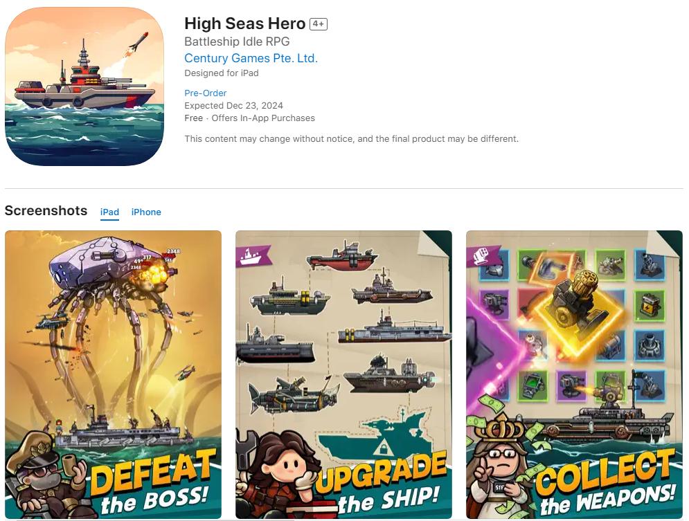 《High Seas Hero》在11月初开启了海外市场的预订,App Store页面显示预计在12月23日上线。这款游戏在今年早些时候以《Battleship Brawl》为名开启了海外测试,10月底的时候下架了测试版本,预计离正式上线不远。