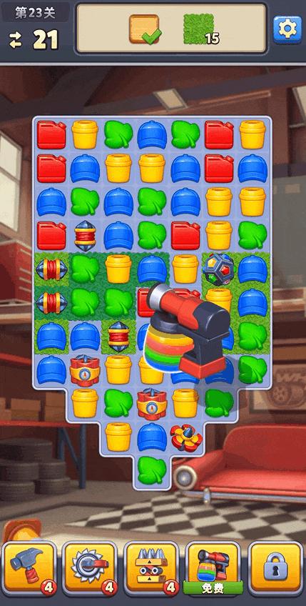 另外《Truck Star》对额外道具也做了调整。原本《Royal Match》中设计了「小丑帽」道具(打乱棋盘元素),这一道具在《Truck Star》被删除。取而代之的是结合修车题材新增了「喷漆枪」道具,可以随机将数个距离较近的元素修改成同一种颜色。因此每次使用「喷漆枪」时,大概率会通过自动合成获得2个或更多的辅助道具(火箭、炸药桶、螺旋桨、灯球)。