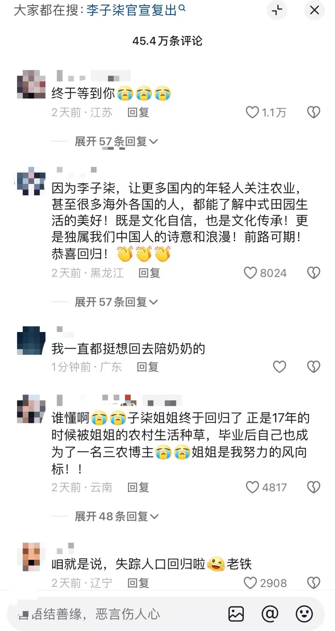 消息过于突然,以至于很多人的第一反应是恍惚甚至不敢相信,“原来是真的回来了”、“啊啊啊啊啊是李子柒!我看到以为这个账号是假的。”