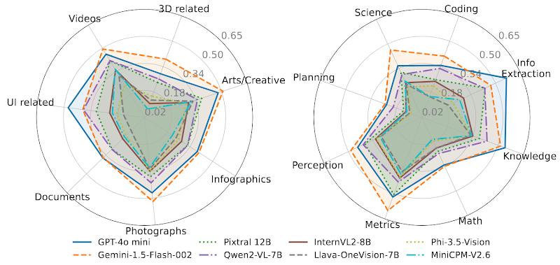 然而,Gemini 1.5 Flash在用户界面相关的输入和信息提取任务上的表现落后于GPT-4o mini。