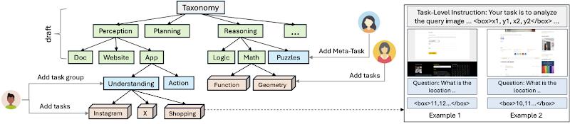 MEGA-Bench的构建过程始于任务分类树的设计。首先定义了一个初步的分类树,将任务按照大类划分为“感知”、“规划”和“推理”等顶层类别,每个大类下再细分为更具体的子类,如“文档理解”、“应用理解”和“逻辑推理”等。这种自上而下的分类框架确保了任务覆盖的广度,并减少了重复任务的可能性。